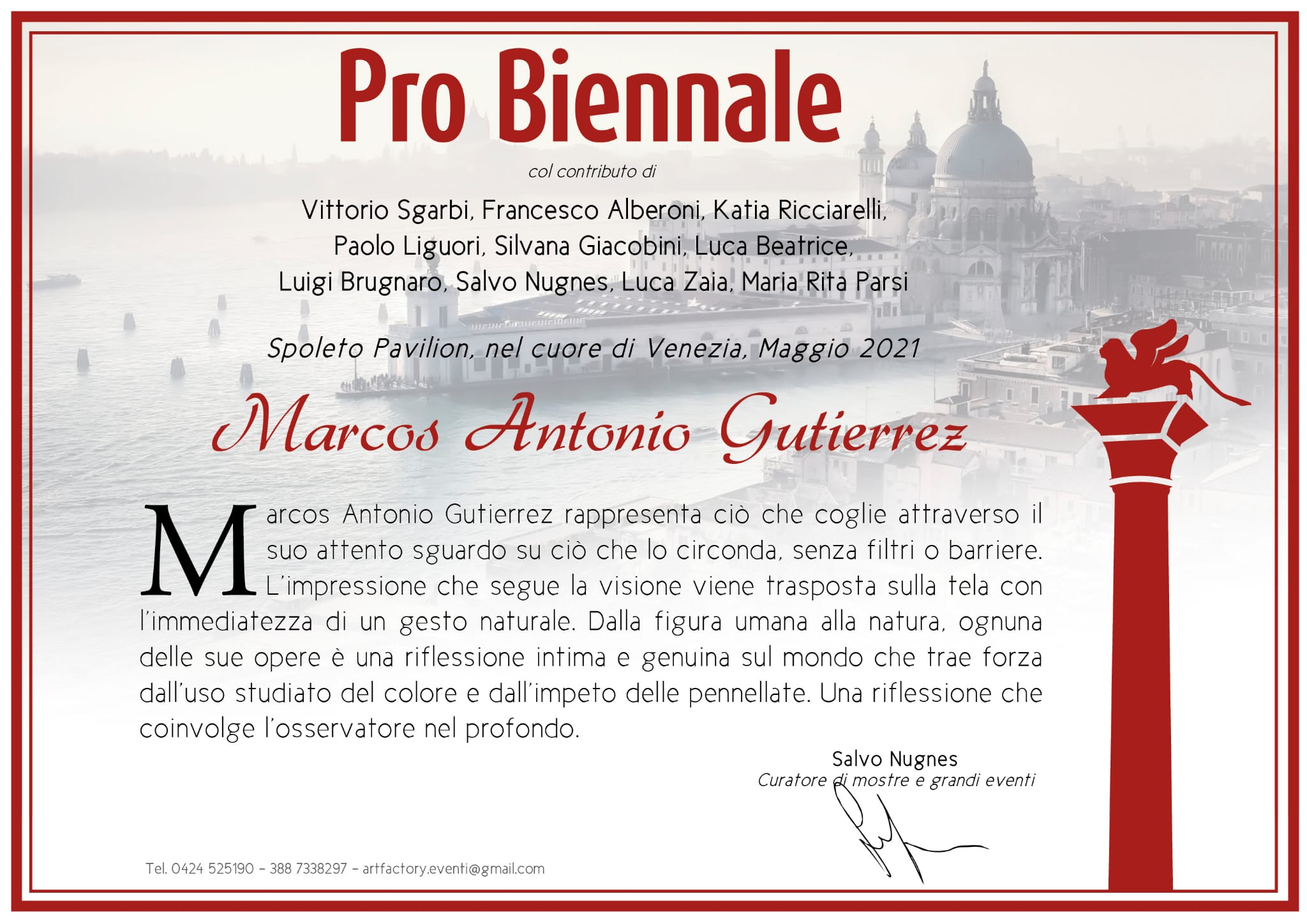 Infatti, l’artista è stato selezionato dal Prof. Giorgio Gregorio Grasso a partecipare a LA PRIMAVERA DELL’ARTE A VENEZIA, dal 10 al 30 maggio.