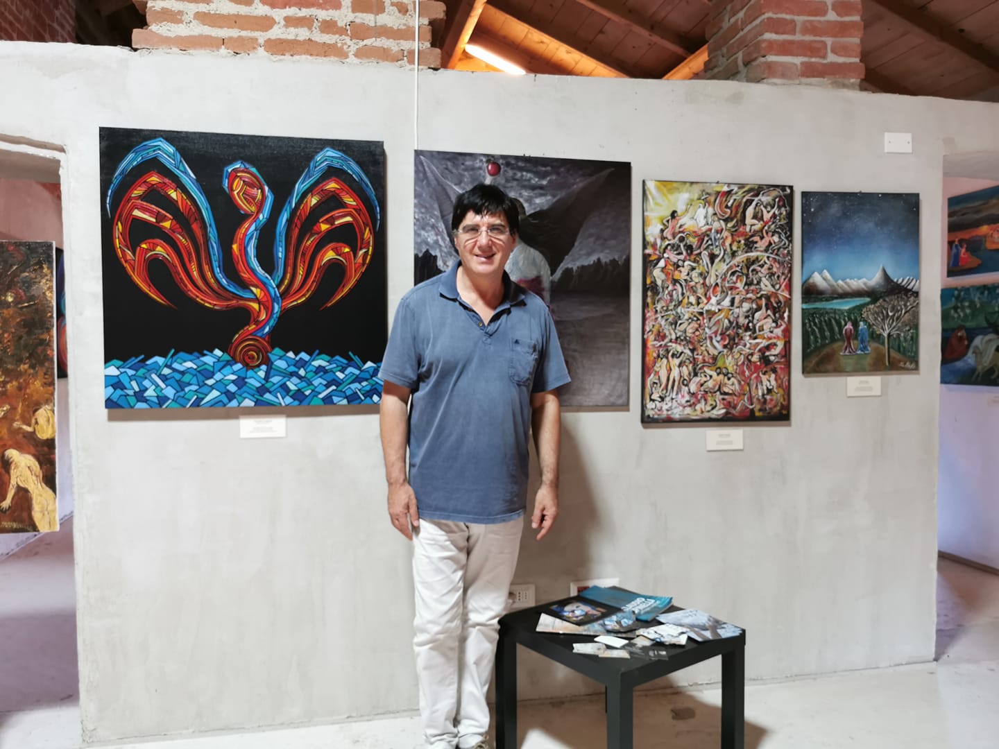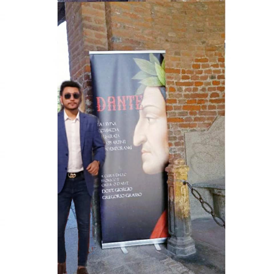 L’artista romano è poi stato selezionato dallo stesso Prof. Grasso per raccontare uno dei canti della Commedia di Dante. Perciò ha esposto una sua opera presso il famoso palazzo nobiliare di campagna, Rocca Brivio Sforza, sito nei pressi del fiume Lambro, a San Giuliano Milanese.