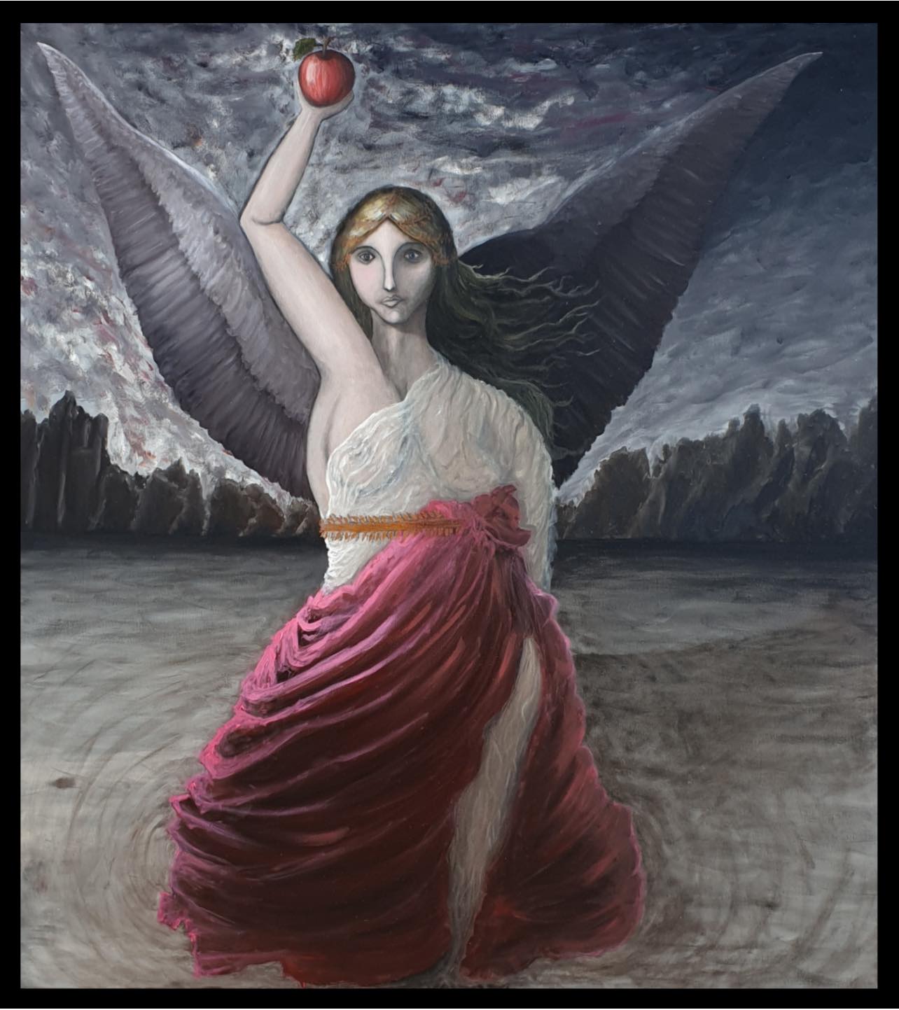 Donne caratterizzate da profondi occhi blu, come il cielo infinito, colore dell’inconscio e della meditazione a cui l’artista sembra particolarmente attento.