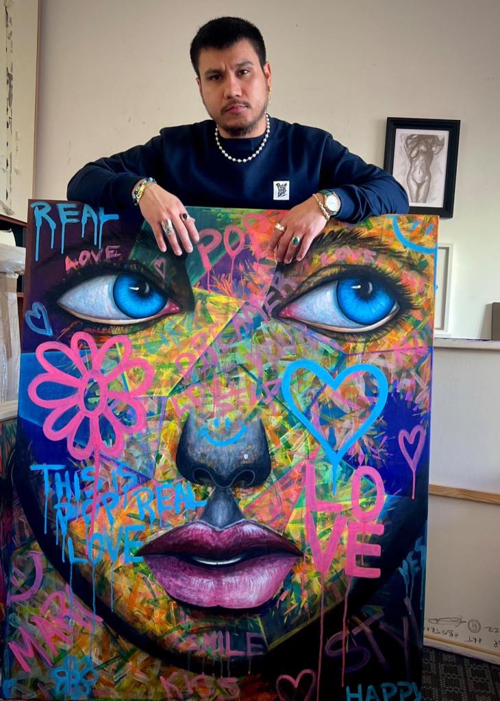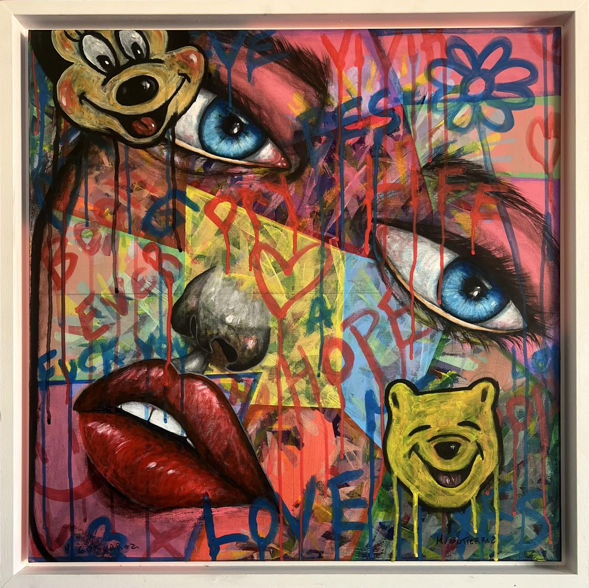 Attorno, un’esplosione di rosa elettrico, blu cobalto, giallo che scotta la retina. E poi simboli, cuori che pulsano come ferite, graffiti che sembrano urla soffocate, Winnie the Pooh e Topolino che sorridono beffardi davanti a un volto.