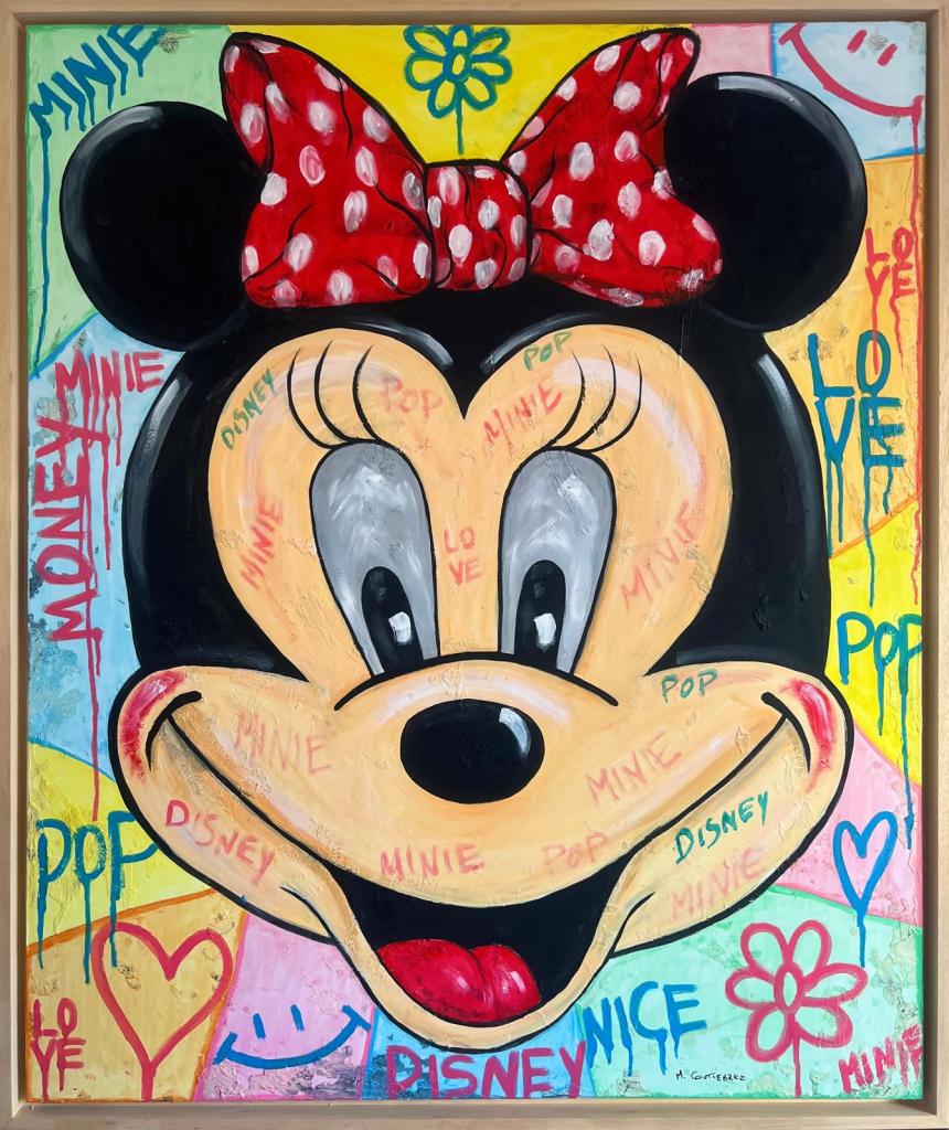 La prima tela ci proietta immediatamente in un territorio familiare, ma lo fa con l’intento di scardinarne le certezze. Il volto di Minnie, icona universale di un’innocenza commercializzata, diventa il campo di battaglia di una riflessione agrodolce sulla nostra cultura.